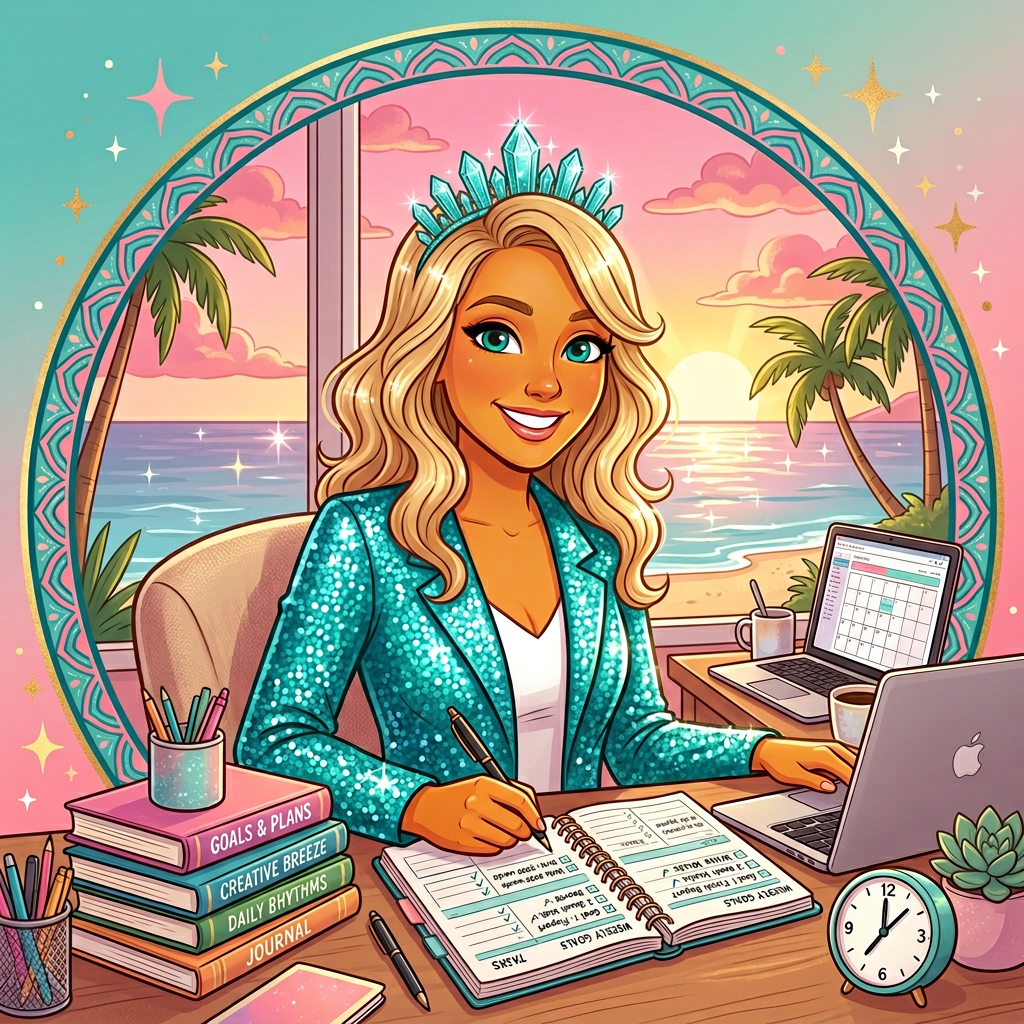 Journaling at her desk with the 34-minute timer running, books stacked beside her — Road to Resilience, Krystal Clear Life Planner, Crews Beyond Limits. Laptop open, ocean view through the window, sunshine making every crystal sparkle. Building empires one habit at a time.